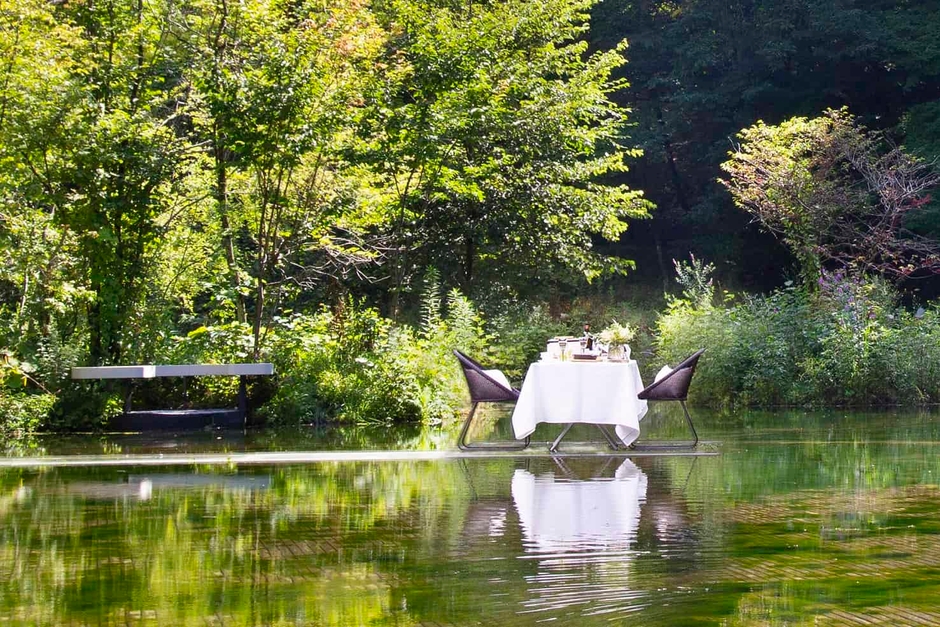 2020年春は、その水上パノラマ席にて朝食を提供します。周囲を森と水に囲まれており、席からは美しい非日常の景色が眺められます。朝の森はにぎやかで、野鳥のさえずりが至るところから響きます。1組限定、二人きりの空間で朝を過ごすことができます。