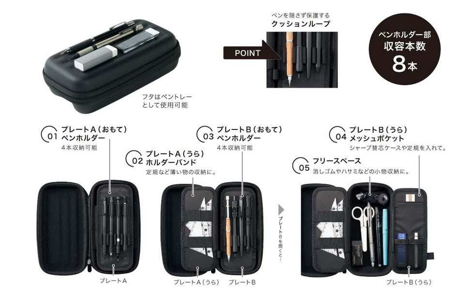衝撃に強いEVA素材を外装に使用したハードシェルタイプのペンケースで、クッションループに入れた筆記具を外からも守ります。筆記具だけでなく、プレート裏面、フリースペースにも収納スペースがあり、定規や小物も収納できます。フタの溝はペントレーとしても使用できます。