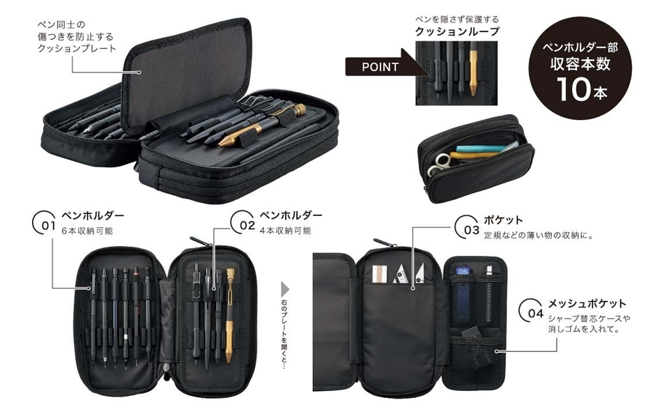 ナイロン生地を使用したベーシックな大容量タイプのペンケースです。シリーズ最大の収容量で10本のお気に入りの筆記具を携帯することができます。