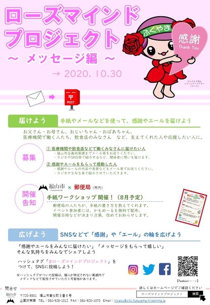 広島県福山市では,新型コロナウイルス感染症対策の一環として,経済活動や芸術活動など様々な活動の自粛,休校などの期間に支えてくれた人や,これからの経済活動の再開等に向けて応援したい人たちに対し,本市が培ってきたローズマインドを通じて「感謝」や「エール」を送る「ローズマインドプロジェクト」を開始します。