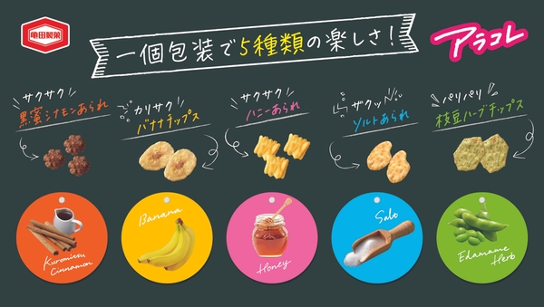 『80g 洋風あられコレクション アラコレ』で人気だった「ハニーあられ」と、当社商品で人気のパーツ「黒糖シナモンあられ」、そしてトレンド素材の「バナナチップス」、そこに「ソルトあられ」や「枝豆ハーブチップス」も加わって、1個包装での見た目や味のバラエティー感を充実させました。