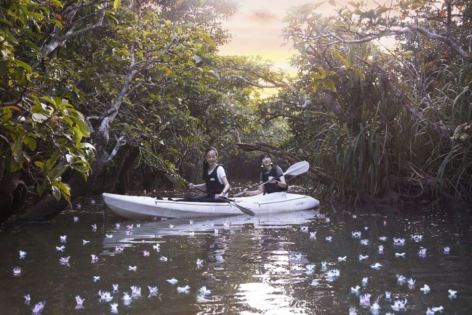 西表島は日本国内のマングローブ林の約90%を有するため、どの地域よりも広い自生環境があります。川沿いにも自生するので、川が豊富にある西表島では、落下した花が川面に浮かぶ姿が見られます。淡い薄桃色の花が水面を埋め尽くし、まるで絨毯を敷き詰めたかのような景観を楽しめます。この絶景を楽しんでもらうため、朝食や場所、時間にこだわったプログラムを提案します。
