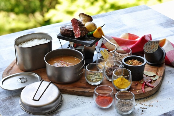 星のや富士では、キャビンや森の中のダイニングでアウトドア料理をラグジュアリーに楽しんでいただけます。キャビンでゆっくり過ごしたい方は、テラスリビングでの「グランピングカレー」がおすすめ。ボリュームたっぷりの牛肉と野菜を富士山の溶岩プレートでお客様ご自身でグリルし、5種類のスパイスを好きに組み合わせオリジナルの味に仕上げます。また、組数限定の屋外ダイニングでは狩猟肉ディナーを提供しています。春はさっぱりとした肉質になる猪や鹿を、山菜や筍などとともにグランピングマスターとダッチオーブンで仕上げます。デザートは桜のアイスクリーム。お客様ご自身でフレッシュないちごを火にかけて果実のソースを作り、桜のアイスクリームにかけていただきます。トッピングの抹茶のクランブルが味と食感にアクセントを効かせます。