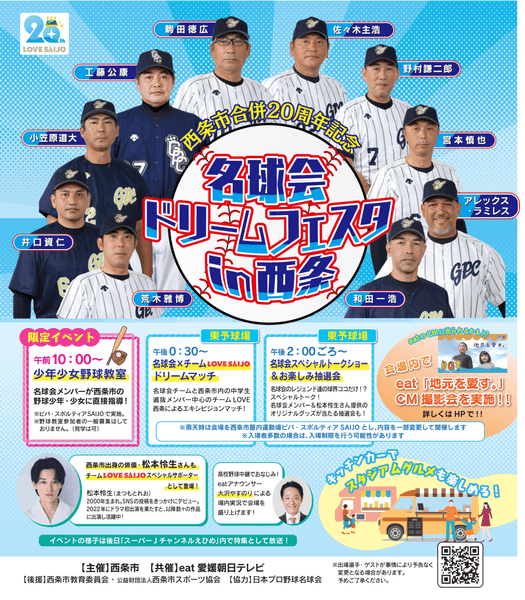 愛媛県西条市合併20周年を記念し、eat愛媛朝日テレビは西条市と共催で「名球会ドリームフェスタin西条」を開催します。日本プロ野球名球会のレジェンドたちで結成するドリームチームによる記念試合やスペシャルトークショー、少年少女野球教室などのイベントが行われます。