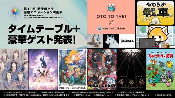 すでに発表済みの『海がきこえる』、『トラペジウム』、『傷物語 –こよみヴァンプ-』、『ガールズバンドクライ』の上映や関係ゲストによるトークの詳細に加え、コンペティション長編部門入選作品の『化け猫あんずちゃん』、『ルックバック』のメイキングトーク、国際審査員である平尾隆之氏の監督作品『映画大好きポンポさん』の35mmフィルム版上映、DTMユニットのパソコン音楽クラブのライブパフォーマンスと、ライブコーディングによりリアルタイムに映像を生成するRenard氏のVJとのライブセッション「OTO TO TABI × NEW CHITOSE 2024 エアポート音楽会」、ワールドワイドな話題作を続々と手掛ける株式会社ファンワークスにフォーカスした無料上映&トークプログラム、海外のスタジオや映画祭特集上映、国際審査員による上映&トークなど、ここでしか見られない多種多様なプログラムを開催します。