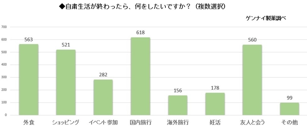 「自粛生活が終わったら、何をしたいですか?」と複数選択で質問したところ、もっとも多い回答は「国内旅行」618名でした。そして「外食」563名、「友人と会う」560名、「ショッピング」521名、「イベント参加」282名と続きました。「妊活」と答えた方は17.9%にあたる178名でした。