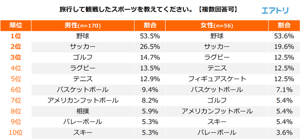 ―旅行に行って観戦したスポーツを聞いたところ、男女ともに「野球」と回答した人が5割を超えました。2位は「サッカー」、3位は男性が「ゴルフ」、女性は「ラグビー」でした。
