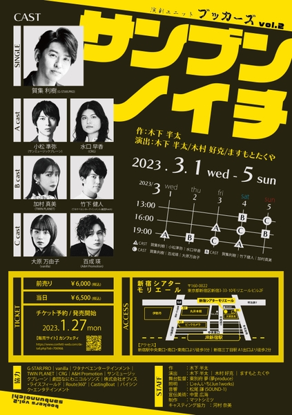 演劇ユニット ブッカーズ vol.2『サンブンノイチ』が2023年3月1日 (水) ~2023年3月5日 (日)に新宿シアターモリエール(東京都新宿区新宿3-33-10 モリエールビル2F)にて上演されます。