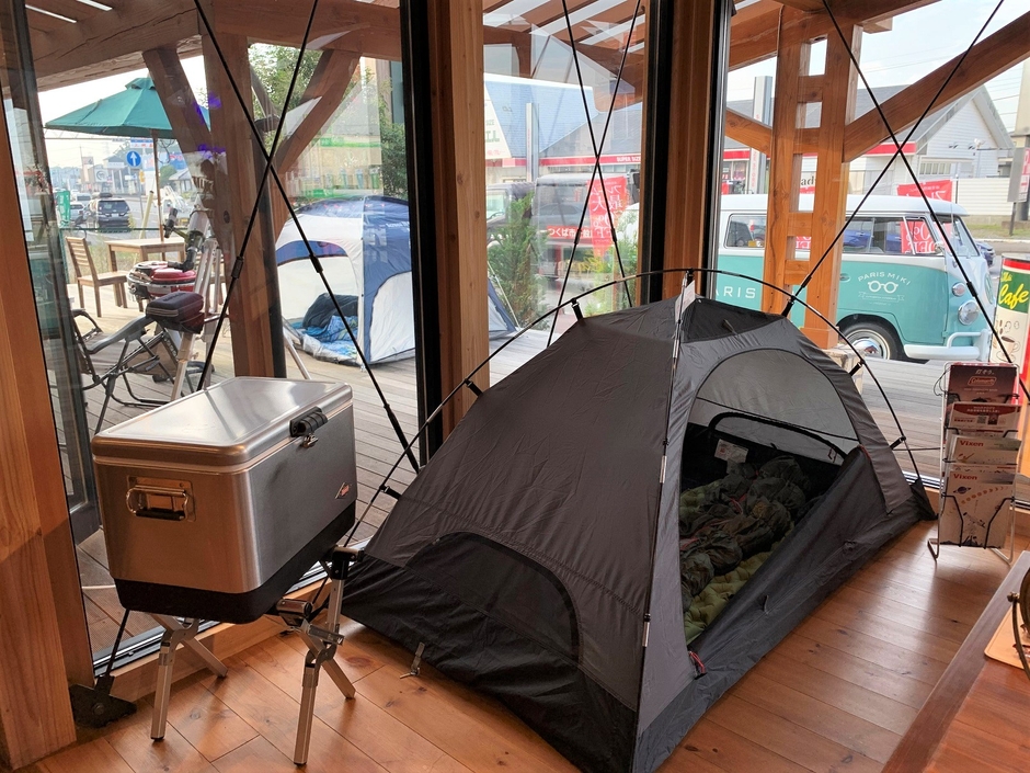 今回のイベントのテーマは「キャンプ」。〝ソロキャンプ〟〝ファミリーキャンプ〟〝おうちキャンプ〟のカテゴリーに分けて、店内外に実際にテントを張ってキャンプ道具と一緒に展示しています。お客様が実際に道具を触って確かめられ、ご購入をご希望の方にはコールマンジャパンECサイトに誘導します。