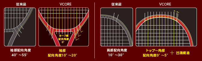 VCOREシリーズは一般的な円形ラケットよりスウィートエリアが7%※広い弊社独自の形状理論「アイソメトリック」に加え、フレームの空気抵抗を大幅に低減し、ヘッドスピードを加速させる構造「Aero Trench(エアロトレンチ)」を採用することで高弾道ハイスピンショットを繰り出し、相手をベースライン後方に張りつけ、ゲームを支配することを可能にします。