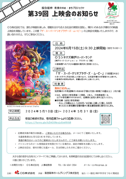 シネマコンプレックス「OSシネマズ」を経営するオーエス株式会社(本社:大阪市北区、代表取締役:髙橋秀一郎)は、阪急阪神ホールディングスグループの社会貢献活動「阪急阪神 未来のゆめ・まちプロジェクト」の一環として、知的障がいや発達障がいを持つお子様とそのご家族を対象とした映画上映会を、6月15日(土)にOSシネマズ神戸ハーバーランドで実施いたします。
