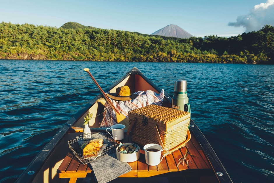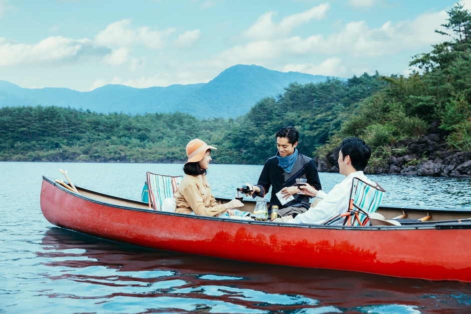 カヌーに乗って湖上から樹海を観察します。場所は富士五湖のひとつである西湖です。西湖では、湖に流れ込みながら固まった溶岩の姿、その上に育つ樹海の植物を間近に見ることができます。乗船するカヌーには、向かい合って座ることができるチェアとテーブルが用意されています。ソムリエの資格を持つグランピングマスターが選んだお酒とおつまみを、カヌーに乗りながら楽しめます。グランピングマスターは、別のカヌーで並走してお酒やおつまみの提供を行い、優雅で快適なアペリティフタイムをサポートします。また、プロのインストラクターがお客様のカヌーをけん引するので、波に流される心配なく、透明度の高い美しい湖と樹海が織りなす景色を眺めることができます。