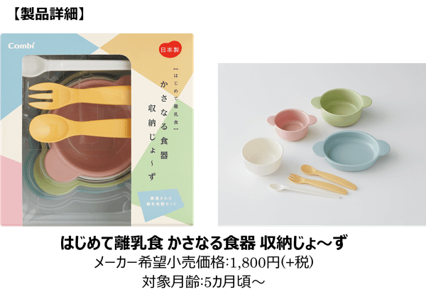 コンビ株式会社は、成長に合わせてずっと使えて収納にもこだわった日本製食器セット「はじめて離乳食 かさなる食器 収納じょ~ず」を、2019年8月上旬より、全国のベビー用品専門店やGMSなどで販売いたします。