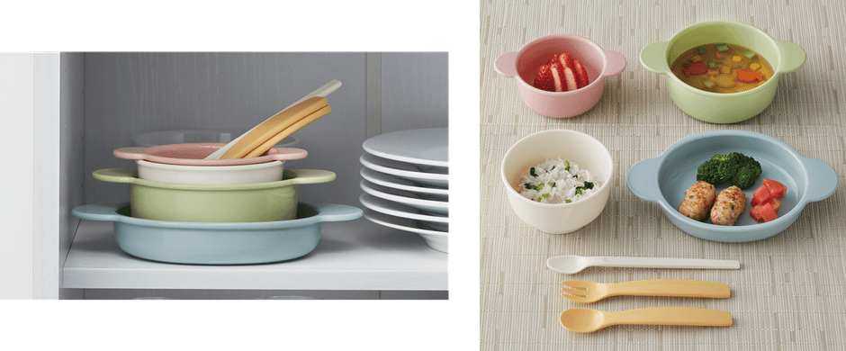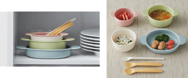 また、食器のデザインには日本伝統の配色法「かさねの色目」を用いて、毎日の離乳食メニューに彩りを加えます。