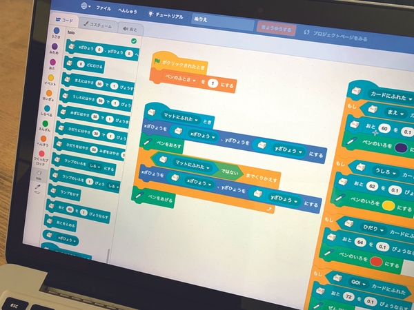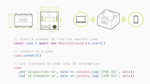 本日4/23より単体として新発売される「toio™コア キューブ」にはリアルタイム絶対位置検出、6軸姿勢検出・イベント検出といった長期の研究を経て実現されたテクノロジーが詰まっています。プログラミング教室でおなじみのビジュアルプログラミングも、JavaScript等のプログラミング言語の使用も可能ですから、ロボット工学や自動運転・ゲーム開発などで培われた技術を手軽に応用して、ロボットプログラミングをすることができます。