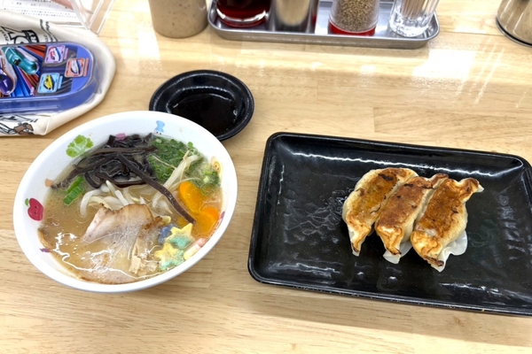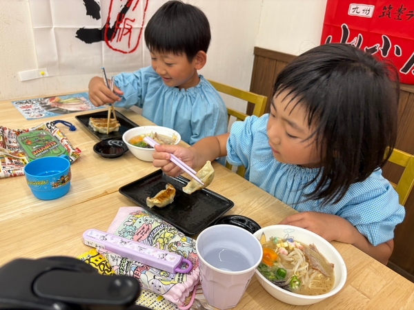 飾りつけのあとは、「山小屋 創業店」で食育を兼ねて香春町産の野菜(オクラ・ニンジン)をトッピングしたイベント限定「七夕ラーメン」(ハーフサイズ)と餃子(3個)を実食。