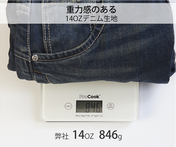 02 厚すぎず薄すぎない高品質の14OZ生地、穿き心地抜群。