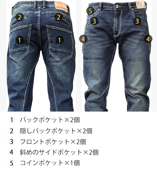 従来の5P仕様以外に、斜めのサイドポケット×2個、隠しバックポケット2個を追加し、今までにない多種多様なポケットは、「TSUTEY」のデザイン性に一味違いを加え、実用性も抜群です!