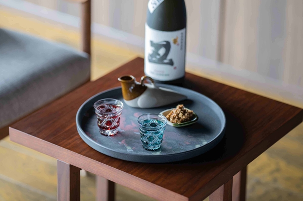 客室では、鹿児島県奄美大島で限定千本しか製造されない焼酎「開運伝説」を提供します。その年を無事に過ごせたことに感謝し、翌年の努力を決意する蔵人が丹精こめてつくる焼酎はコクと香りの強い味わいです。そんな貴重な焼酎を縁起の良い文様が刻まれた金赤の薩摩切子のグラスで提供します。