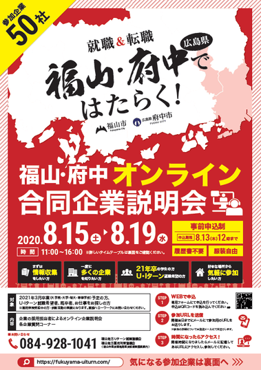 広島県福山市では、新型コロナウイルス感染症の影響で,直接的な就職活動が難しくなっている学生の皆さんやU・Iターン就職を希望している方など求職活動中の方々を対象に,福山地方Uターン就職協議会と福山地方雇用対策協議会(いずれも事務局は福山市経済環境局経済部産業振興課内)が共催で,オンライン合同企業説明会を初開催します。