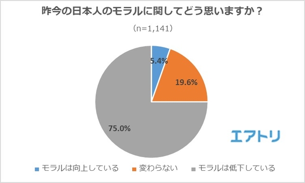 「モラルは低下している」と回答した人が75.0%と大多数を占めました。次に多かったのが「変わらない」の19.6%、「モラルは向上している」と回答した人はたった5.4%でした。