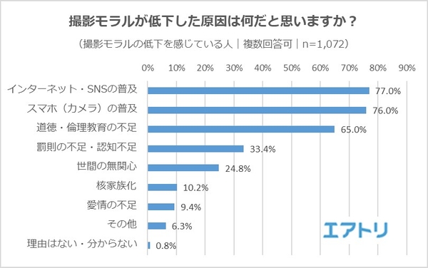撮影モラルの低下を感じている人に対して低下の原因を聞いたところ、「インターネット・SNSの普及」(77.0%)と「スマホ(カメラ)の普及」(76.0%)と回答した人が大多数となりました。物やサービスが豊かになったことが理由の1・2位に挙がる一方で、3位には「道徳・倫理教育の不足」(65.0%)がランクインしました。