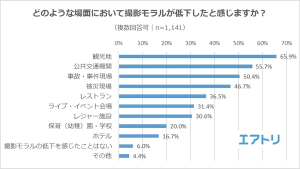 「撮影モラルの低下を感じたことはない」と回答した人は6.0%しかおらず、大多数の人がどこかしらの場面で撮影モラルの低下を感じているようです。中でも最も意見が多かったのが「観光地」(65.9%)、続いて「公共交通機関」(55.7%)、「事故・事件現場」(50.4%)までは「モラルの低下を感じる」と答えた人が過半数を超えました。