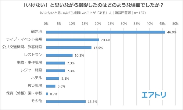 実際に「いけない」と思いながら撮影をした経験がある人に対し、どのような場面だったかを聞いたところ、1位は他を大きく引き離して「観光地」(46.0%)、続いて「ライブ・イベント会場」(20.4%)、「公共交通機関・旅客施設」(17.5%)がランクインしました。「公共交通機関・旅客施設」の中でもほとんどが飛行機や空港、旅行に行く際の新幹線といった日常とは違う場面を挙げており、“なかなか行けない、なかなか見られない、なかなか会えない”といったレアな場面がモラルのない撮影を誘発しがちであることが分かりました。また、回答の中には“他の人も撮影していたから”“どさくさに紛れて撮影した”というものもあり、人混みの中でこそ正しい判断が求められます。