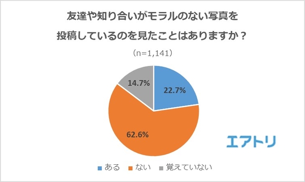 ―調査2で友人や知人がモラルのない写真を投稿しているのを見たことがある人が22.7%いたことを考えると、「ある」の回答が少なく、無自覚でモラル違反を犯している人も一定数いることが窺えました。