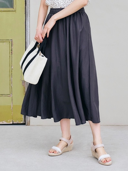 6枚はぎで腰回りをすっきりさせながら、ウエストはゴム仕様で穿き心地も楽ちんなフレアスカート。裾に向かって広がる分量感が上品な雰囲気で、ヒールパンプスを合わせたきれいめスタイルから、Tシャツにスニーカーやスポーツサンダルを合わせたカジュアルスタイルにもアレンジできる万能アイテム。