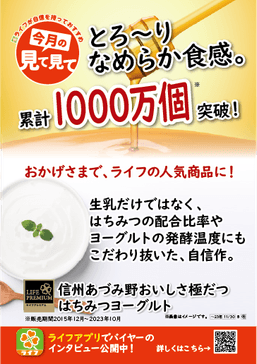 【首都圏ライフ】累計1,000万個突破!お客様に感謝の気持ちを込めて「ライフプレミアム はちみつヨーグルト」が11月限定で40g増量中!