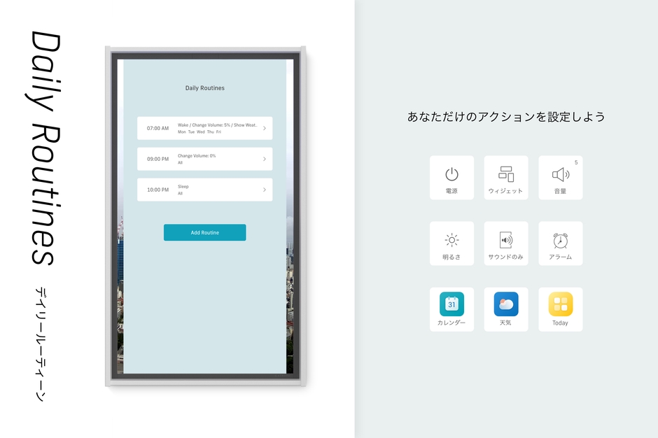 今回のアップデートでは、「カレンダー」「天気」「Today」など、27インチという大きい画面を最大限に利用できるAtmoph独自のアプリ機能が追加され、Googleカレンダーとの連携や、指定の時間にアラームや特定のアクションをセットアップできるデイリールーティーン機能搭載を実現しました。これにより、より個々のライフスタイルにあった使い方を選べ、在宅での作業効率アップ・作業負担減に貢献できるようになりました。