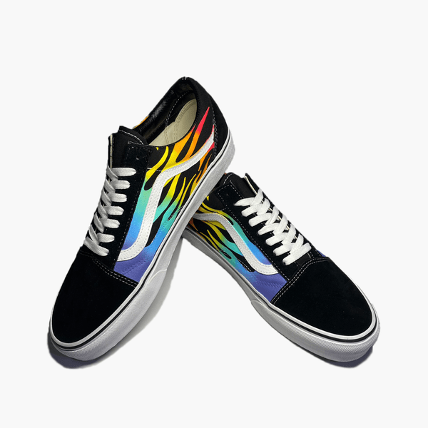 ファイヤーパターンのワイルドさにレインボーカラーの可愛さを残す一足となっている。