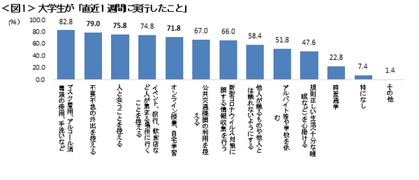 ✔大学生が、「直近1週間で新型コロナウィルスの対策として実行したこと」の割合は、「マスク着用、手洗いなど」が全体の8割以上みられた。また、「不要不急の外出を控える」「人と会うことを控える」「イベント、飲食店など人が集まる場所に行くことを控える」も全体の7割以上みられた。また、大学生活としては、「オンライン授業、自宅学習」も7割以上みられる。<図1>