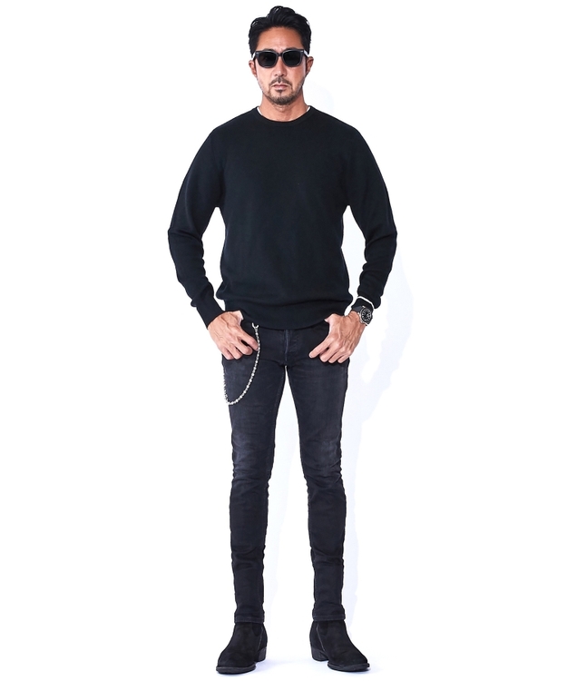 加工は黒色をしっかり残しながらもビンテージライクなUSED加工を入れ、繊細な加工感に拘ったデニムパンツとなっており、雰囲気のある色落ちが特長の素材で履き込むほどにフェード感を楽しんでいただけます。