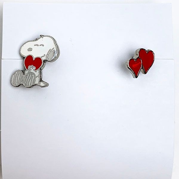 こちらもオススメな、ハートを抱えたスヌーピーのピアスです。左右のデザインが違っていて、片方はハートがモチーフです。縁取りはシルバーカラーです。オンオフ両用できるデザインで、オシャレ♡サイズは1.4×1.2cmです。