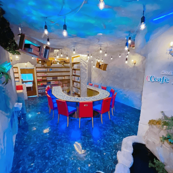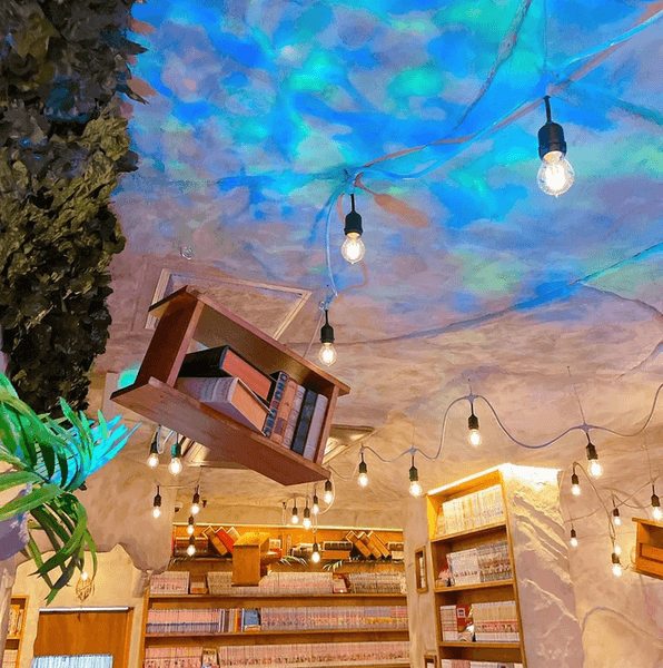 店内は青い幻想的な照明で彩られており、洋書やペンダントライトなどのおしゃれなインテリアが素敵な雰囲気を作り出しています◎
