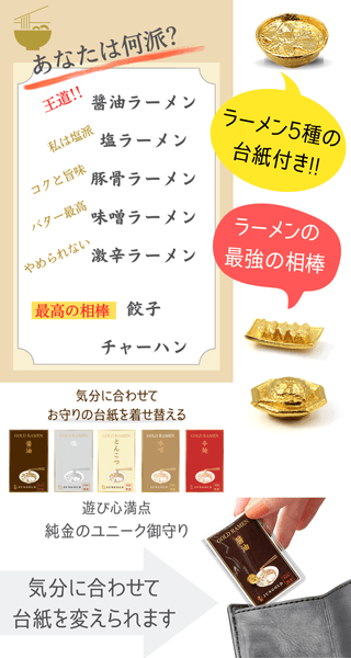金運アップの純金パワーを味方に。純金のラーメンお守りをお財布にいれることで、金のご利益とあふれるラーメン愛を両方楽しんでください。