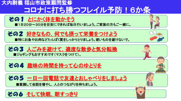広島県福山市は,新型コロナウイルスの感染拡大防止のため,外出を控える高齢者に向けて,フレイル予防のため,大内尉義福山市政策顧問監修のもと,このたび「コロナに打ち勝つフレイル予防6か条」を作成しました。