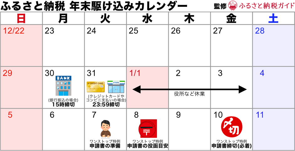 ふるさと納税の年末駆け込みカレンダーでは主に「寄付の締め切り」「ワンストップ特例の申請書の締め切り」について記載しています。