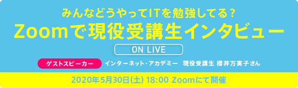 インターネット・アカデミーでは、2020年5月30日(土)18:00より「Zoomで現役受講生へインタビュー!on LIVE」イベントを開催いたします。 本イベントでは、インターネット・アカデミー現役受講生の櫻井さんにゲストスピーカーとしてご参加いただきます!インターネット・アカデミーには、Web・IT業界への転身を志し、初心者から勉強をスタートして理想のキャリアをかなえている受講生がたくさんいます。その実現に向けて、日々、受講生がどんな想いでどのように勉強をしているのか、今回はZoomによるライブ中継でインタビューします。
