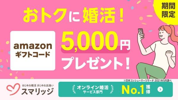 そして、スマリッジでは、出会いの春に婚活をスタートする方々を応援するために、「春の大感謝祭!」と題して3月9日(水)~4月11日(月)の期間内のご登録でアマゾンギフト券5,000円分プレゼントキャンペーンを実施しております。