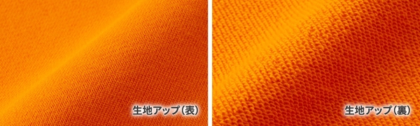 天竺編みを組み合わせた表面は伸縮性がありなめらかな風合い。裏面は裏糸をパイル状に編み込んで浮かせた生地で、タオルのように汗の吸収が良い素材。裏糸は表糸に使用している糸よりあま撚りの太い糸で編み立てているため、肌ざわりが良いのが特徴。