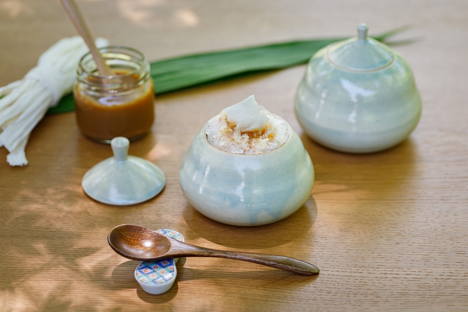 栃木県が国内生産量の95%を誇る「かんぴょう」は、ウリ科の植物である夕顔の実を薄く剥いて干した作物です。界 川治ではその夕顔の形を模した器にふわふわの氷とかんぴょうのシロップ煮を盛り付け、ミルクジャムをひとさじかけて仕上げます。やさしい甘さに癒される一品です。