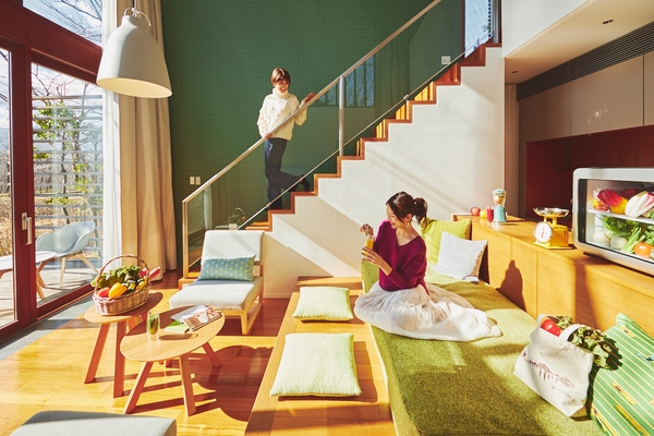 客室は、野菜に親しみながら過ごすことをテーマとした「ベジルーム」です。野菜がたっぷり入った冷蔵庫やスケール、ミキサーが用意され、滞在中はいつでも冷蔵庫から好きな野菜を取り出し、スムージーにして楽しめます。また、野菜と農をテーマにしたクッションや野菜石鹸などのアメニティが設えられる他、本プランで滞在中に摂る野菜の量を記録する「ベジログ」も用意されます。さらに、翌日施設内で行う農体験で着用するつなぎや長靴、手袋も備えられ、手ぶらで気軽に体験に参加するためのアイテムが客室内に整っています。