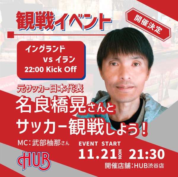 株式会社ハブ(本社:東京都千代田区、代表取締役社長:太田 剛)はHUB渋谷店、HUB新宿区役所通り店にて、元サッカー日本代表選手・プロサッカー選手を招いたサッカー観戦イベントを実施いたします。