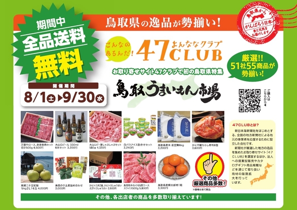 このたび、鳥取県では、新型コロナウイルス感染症の影響により、従来の対面式での物産展の開催が困難なことから、オンラインショッピングモール「47CLUB(よんななくらぶ)」と「楽天市場」で鳥取県WEB物産展を初開催します。