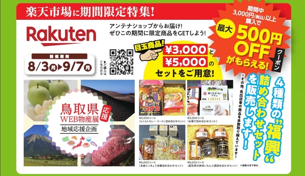 また、「楽天市場」では、東京にあるアンテナショップ「とっとり・おかやま新橋館」がこの鳥取県WEB物産展期間限定で出店します。新型コロナウイルス感染症に打ち克ち、復興を願い福を興す願掛けセット「福興袋」4種を販売しますので、ぜひこの機会にご賞味ください。