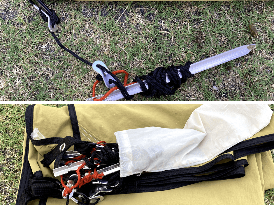 その点、画像のように収納時は各ペグにロープを巻き付けて収納することで絡みをほぼ低減させることができます。これは短いロープならではの良い方法ではと感じています。