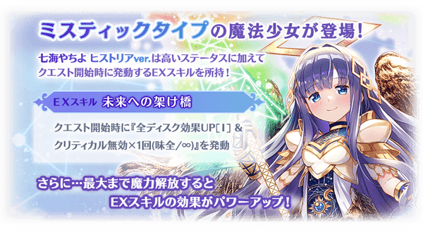 本ガチャより、新魔法少女「七海やちよ ヒストリアver.(CV.雨宮天)」と新メモリア「歴史を残す決戦」「胸の奥で育つ影」が期間限定で登場いたします。